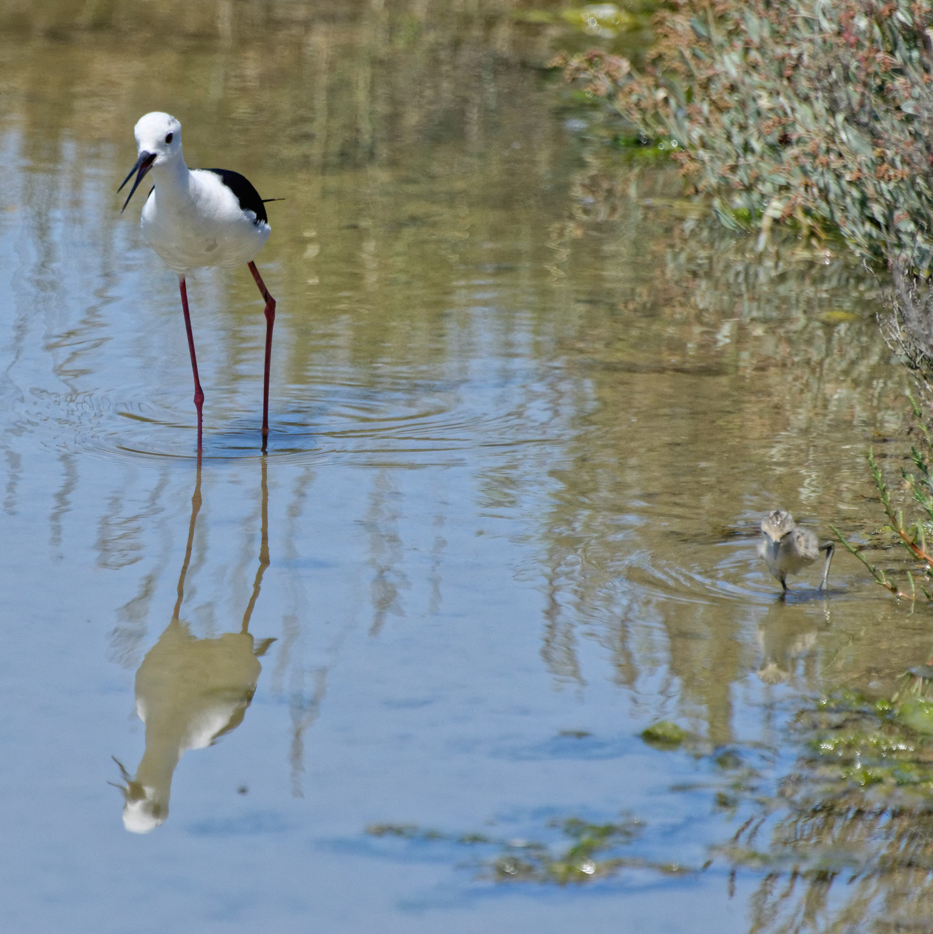 L'échasse blanche (Himantopus himantopus) est un oiseau échassier limicole de taille moyenne (longueur 37 cm et envergure de 75 cm) reconnaissable à ses formes élégantes, ses couleurs contrastées et ses très longues pattes roses semblables à des échasses. Ces image d'une famille d'échasses ont été prises dans la Réserve naturelle nationale de Lilleau des Niges sur l'Ile de Ré durant l'été 2016.