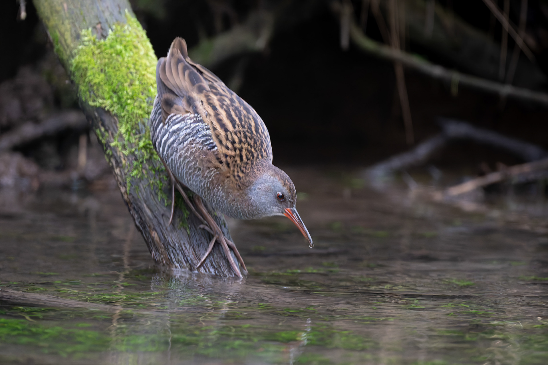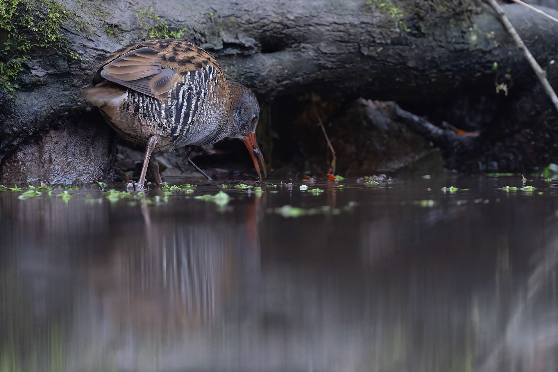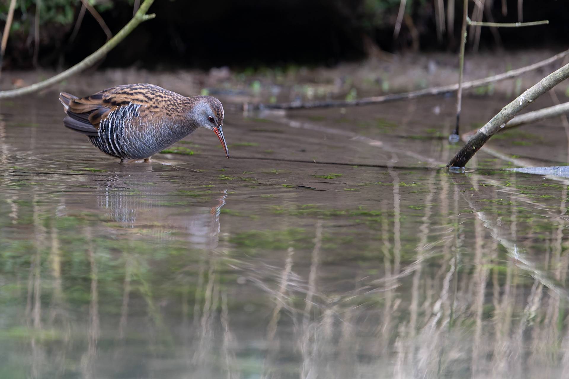 Le râle d’eau avance lentement, souvent à couvert. Il inspecte la végétation flottante, les racines, les dépôts de berge.Son bec agit comme un outil de prospection, précis et discret. Chaque arrêt correspond à une zone à explorer.
