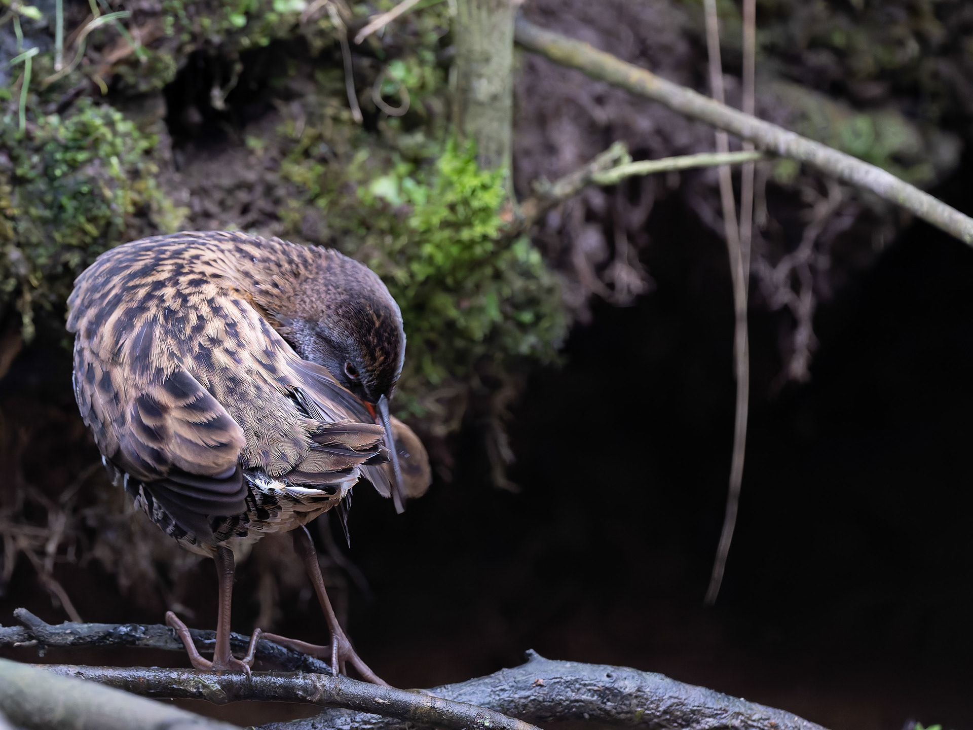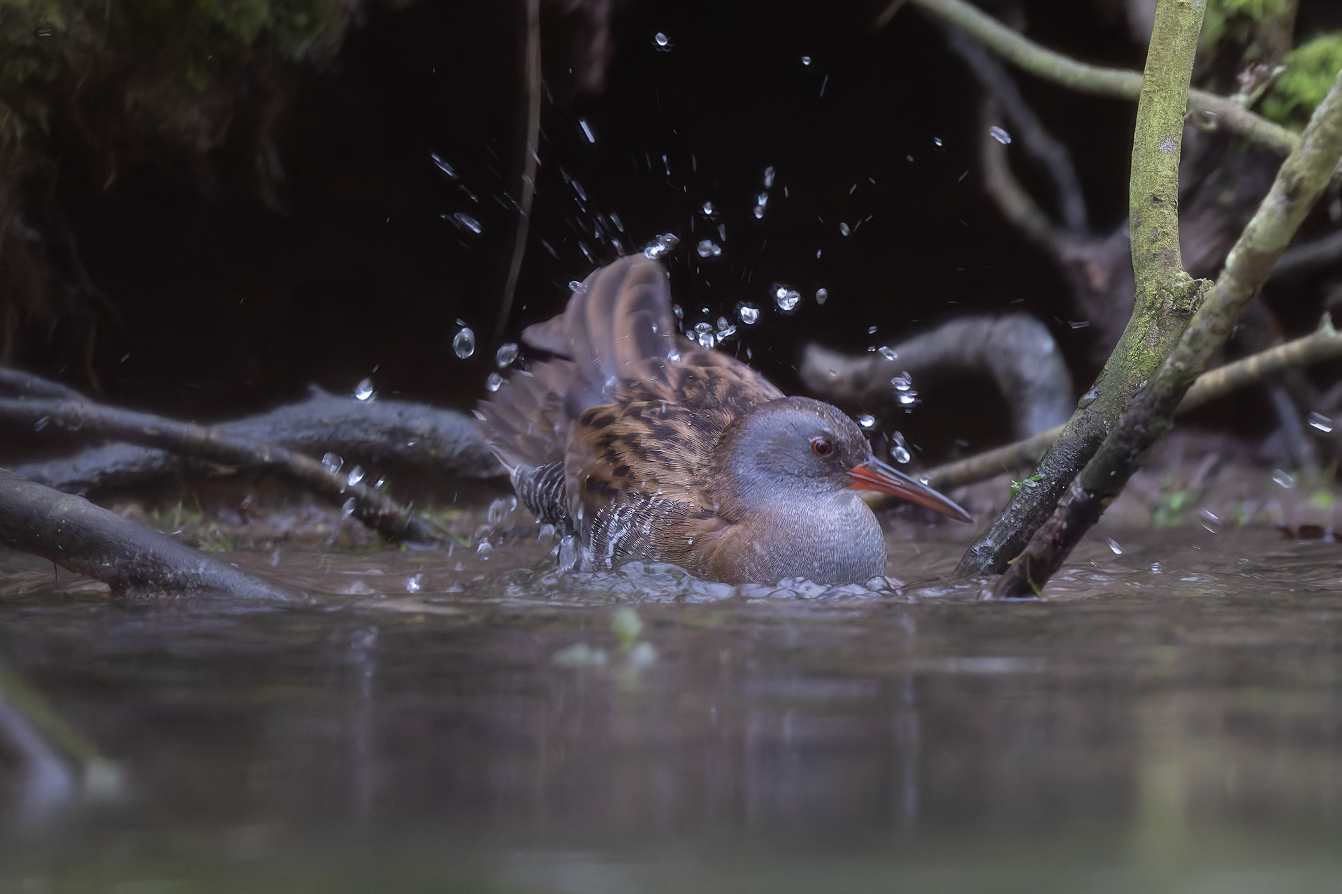 Après le bain, le râle consacre du temps à remettre son plumage en ordre.