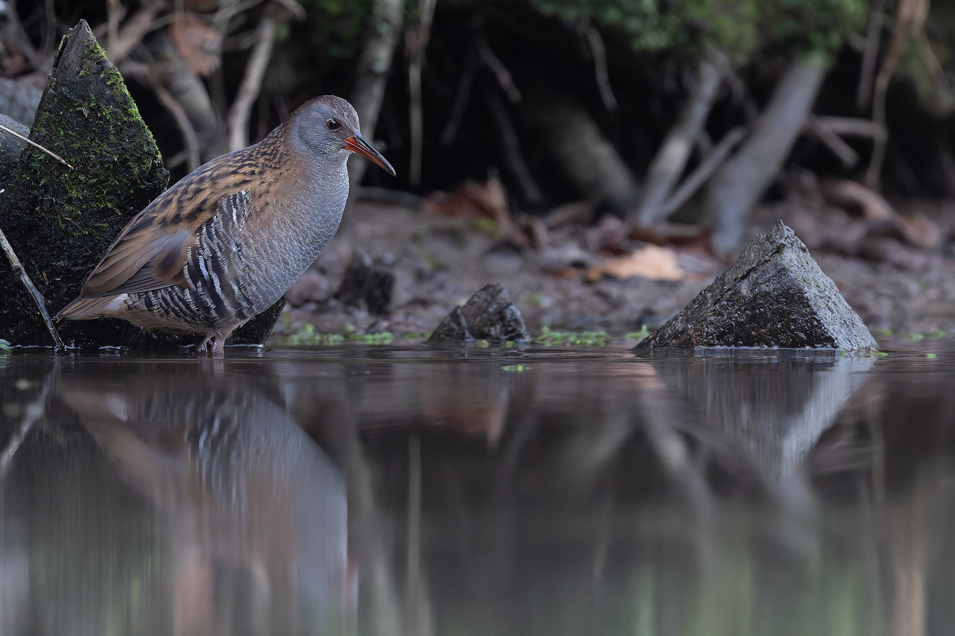 À découvert, le râle se tient immobile, entre eau et pierre.